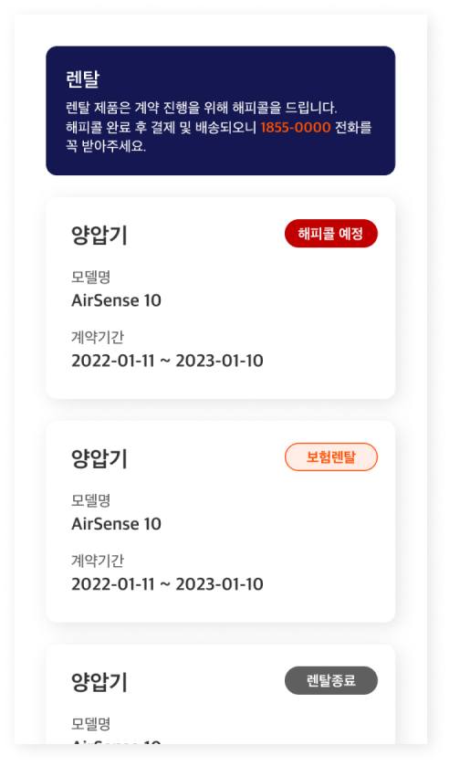 - 글로벌 1위 CRM 시스템의 커스터마이징을 통하여 양압기 사용 기록, AI 알림, 각종 서류 전송과 계약 관리를 손쉽게 이용하실 수 있습니다.